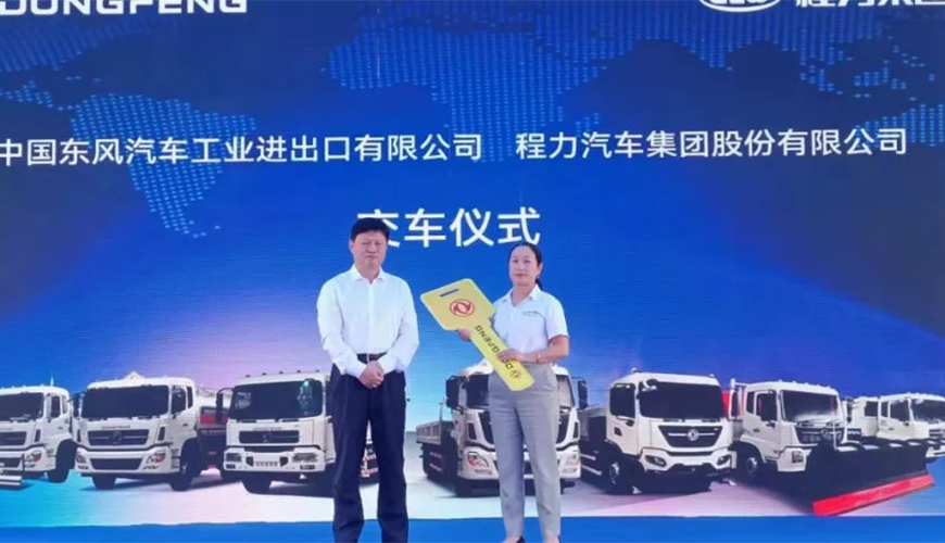 隨后,中國(guó)東風(fēng)汽車(chē)工業(yè)進(jìn)出口有限公司商用車(chē)海外營(yíng)銷(xiāo)部中重型產(chǎn)品總監(jiān)吳永剛與程力集團(tuán)國(guó)際市場(chǎng)部業(yè)務(wù)經(jīng)理陳葦舉行了交車(chē)鎖匙牌授牌儀式。