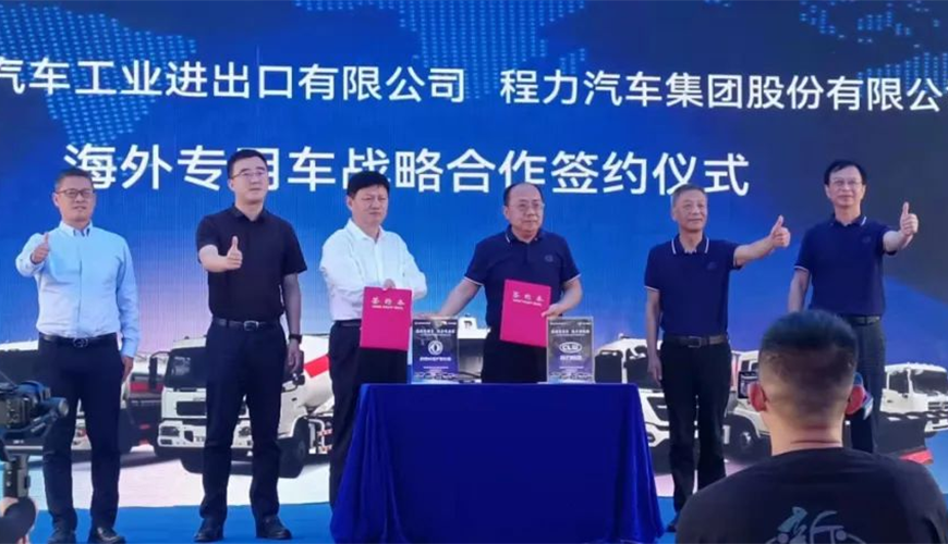 在這次線下大型東風(fēng)商用車海外市場新產(chǎn)品推薦會上,中國東風(fēng)汽車工業(yè)進出口有限公司與程力汽車集團股份有限公司聯(lián)合舉行了海外專用車戰(zhàn)略合作簽約儀式,雙方高層領(lǐng)導(dǎo)簽約后合影紀(jì)念。