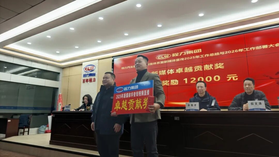 董事長程阿羅作重要指示,為2026年銷售與宣傳工作定調(diào)領航,程董在大會上向獲得銷售一等獎及新媒體優(yōu)秀獎李濤、突出貢獻獎艾惕、卓越貢獻獎黃鑫等獲獎員工及嘉賓,頒發(fā)了獎牌和獎金。程力集團董事長程阿羅為新媒體優(yōu)秀獎李濤頒發(fā)獎牌獎金程力集團董事長程阿羅為新媒體突出貢獻獎艾惕頒發(fā)獎牌獎金程力集團董事長程阿羅為新媒體卓越貢獻獎頒發(fā)獎牌獎金